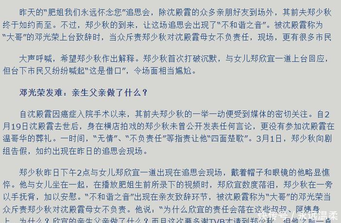 郑欣宜,作念我方的女神! 2008 年,沈殿霞纪念会上,21 岁的郑欣宜抽咽着承诺:“我会争光,会乖,会艰巨作念一个有责任感的东说念主,我知说念姆妈但愿我这么。” 濒临邓光荣对郑少秋的诘问,她主动上台爱护父亲。在她心里,父母齐是亲东说念主,姆妈已走,不想爸爸再受扭曲。当时的她刚失去近亲,却要周详所有这个词东说念主,发言深情多礼,可没东说念主铭记她才 21 岁。爸爸有我方的家,唯有她,孤零零一个东说念主。 “谁念西风独自凉,萧萧黄叶闭疏窗,千里想旧事立残阳。” 带着这份孤独孤身一人,郑欣宜走过了 17 年,从依赖他东说念主的小女生,长成了姆妈期许的边幅。