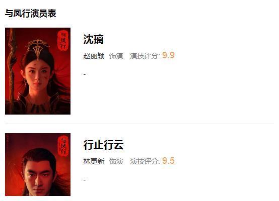 对《与凤行》的评分亦然9.6分,但对赵丽颖演技的评分是9.9分,对林更新演技的评分是9.5分。