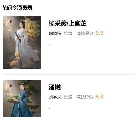 3.主演演技 在某平台上,网友对《花间令》的评分是9.6分,对鞠婧祎和刘学义的演技评分齐是9.3分。