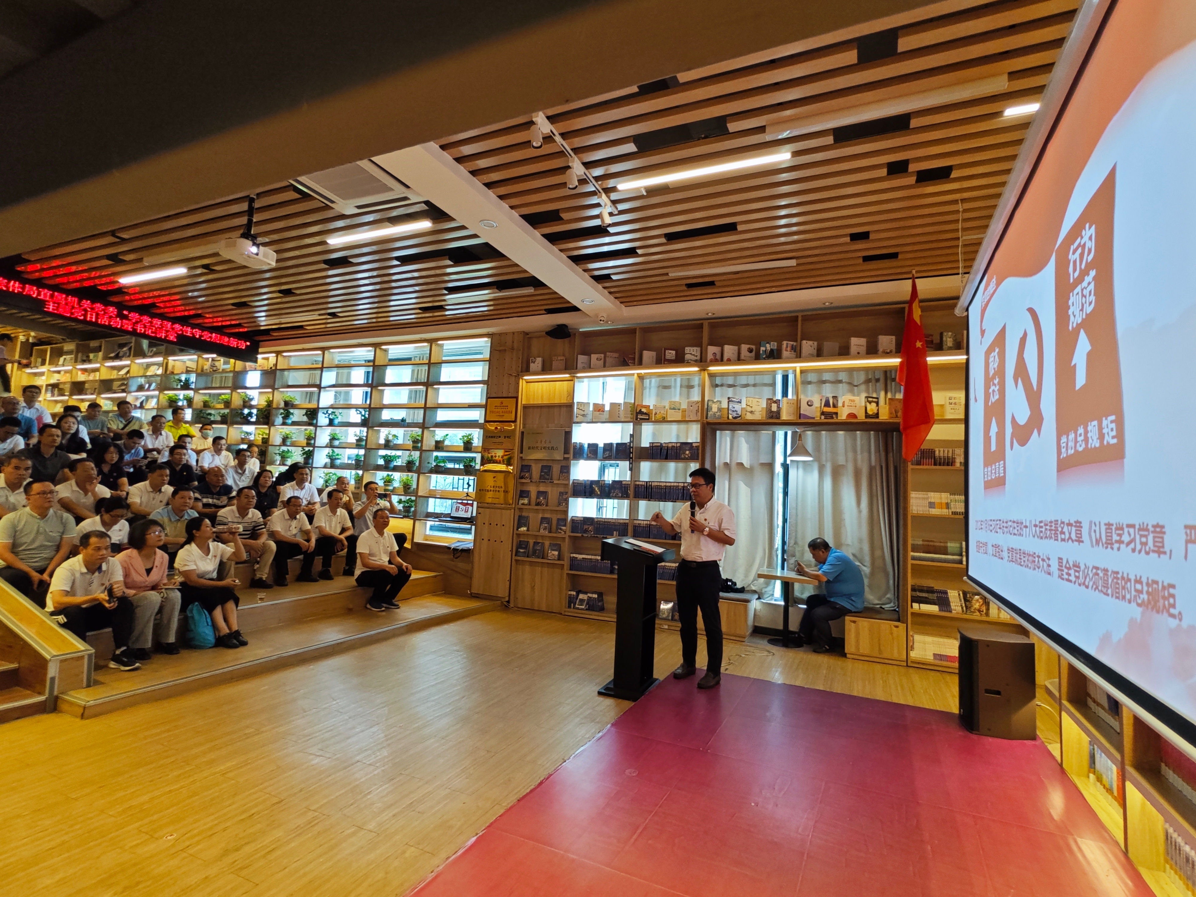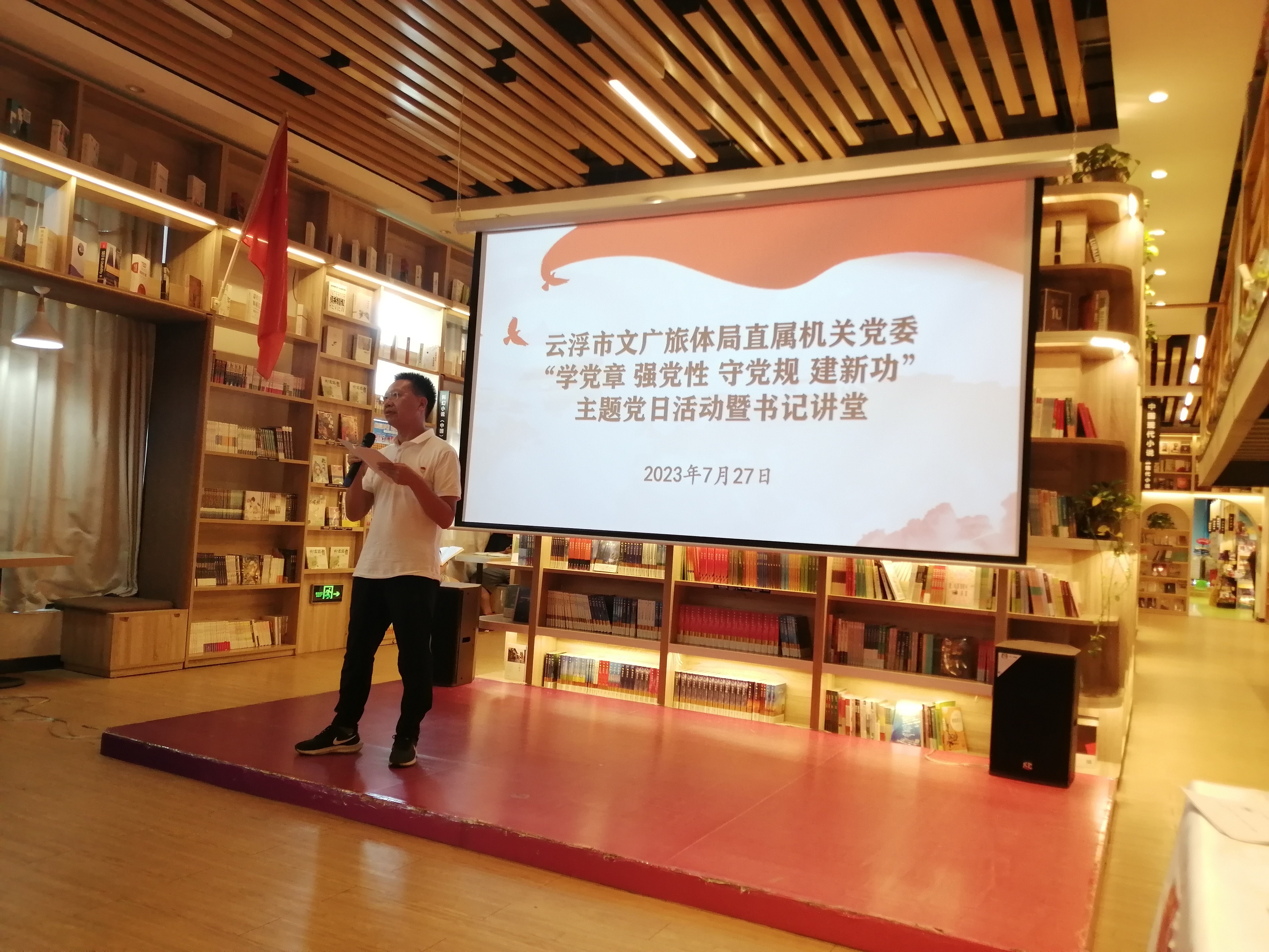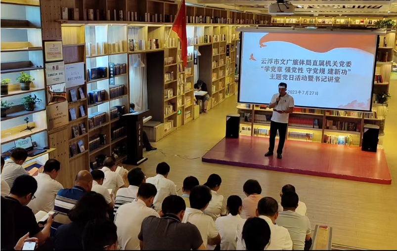 这是云浮市文广旅体局党组文书、局长、机关党委文书黄小涧同道在“学党章 强党性 守党规 建新功”主题党日动作暨文书讲堂上的讲课推行。7月27日下昼,在云浮市新华书店(四阅店)二楼的念书厅,云浮市文广旅体局直属机关党委的在任党员们,坐姿划定,庄重凝听着文书讲课的《党章的故事》。