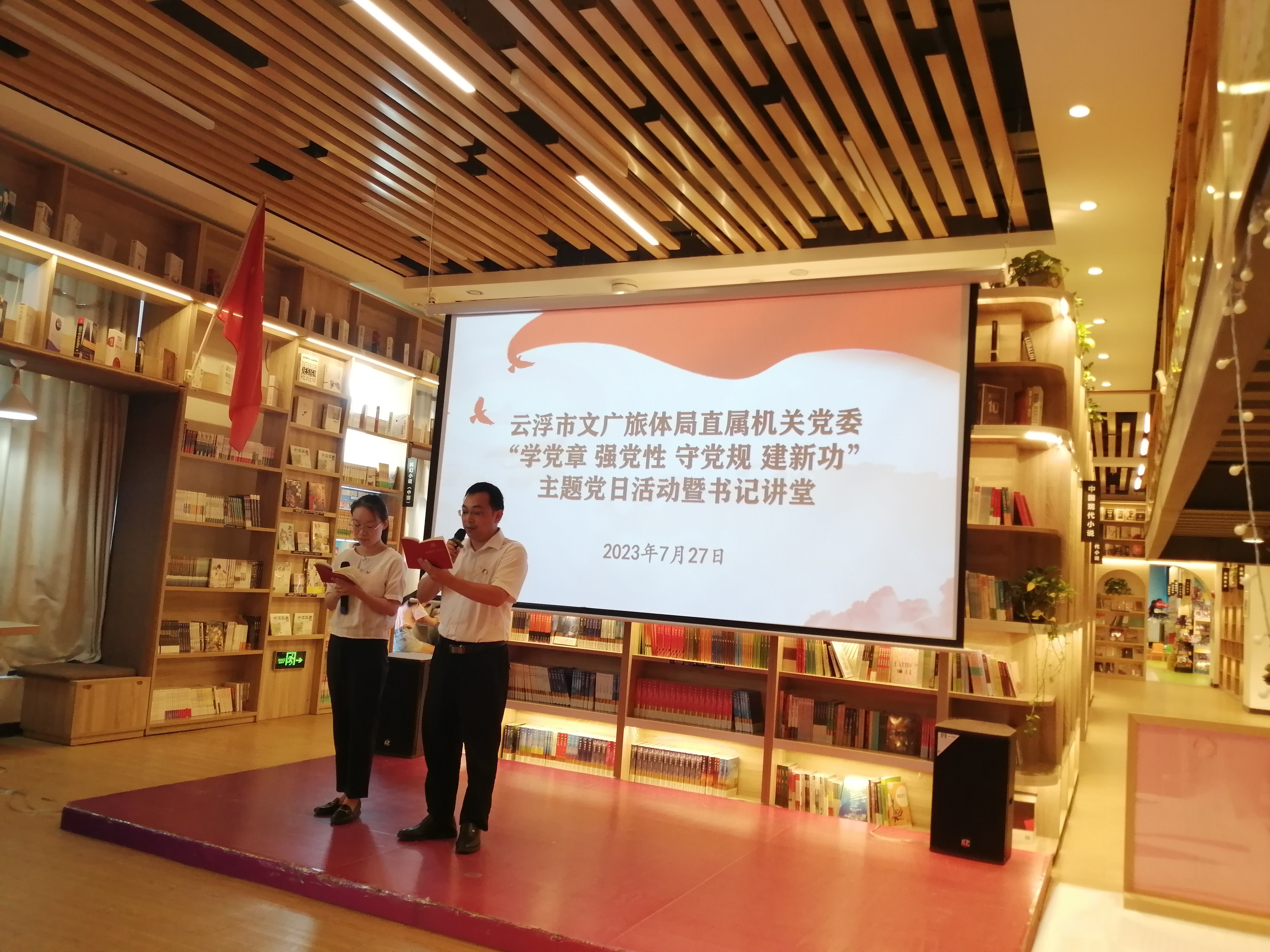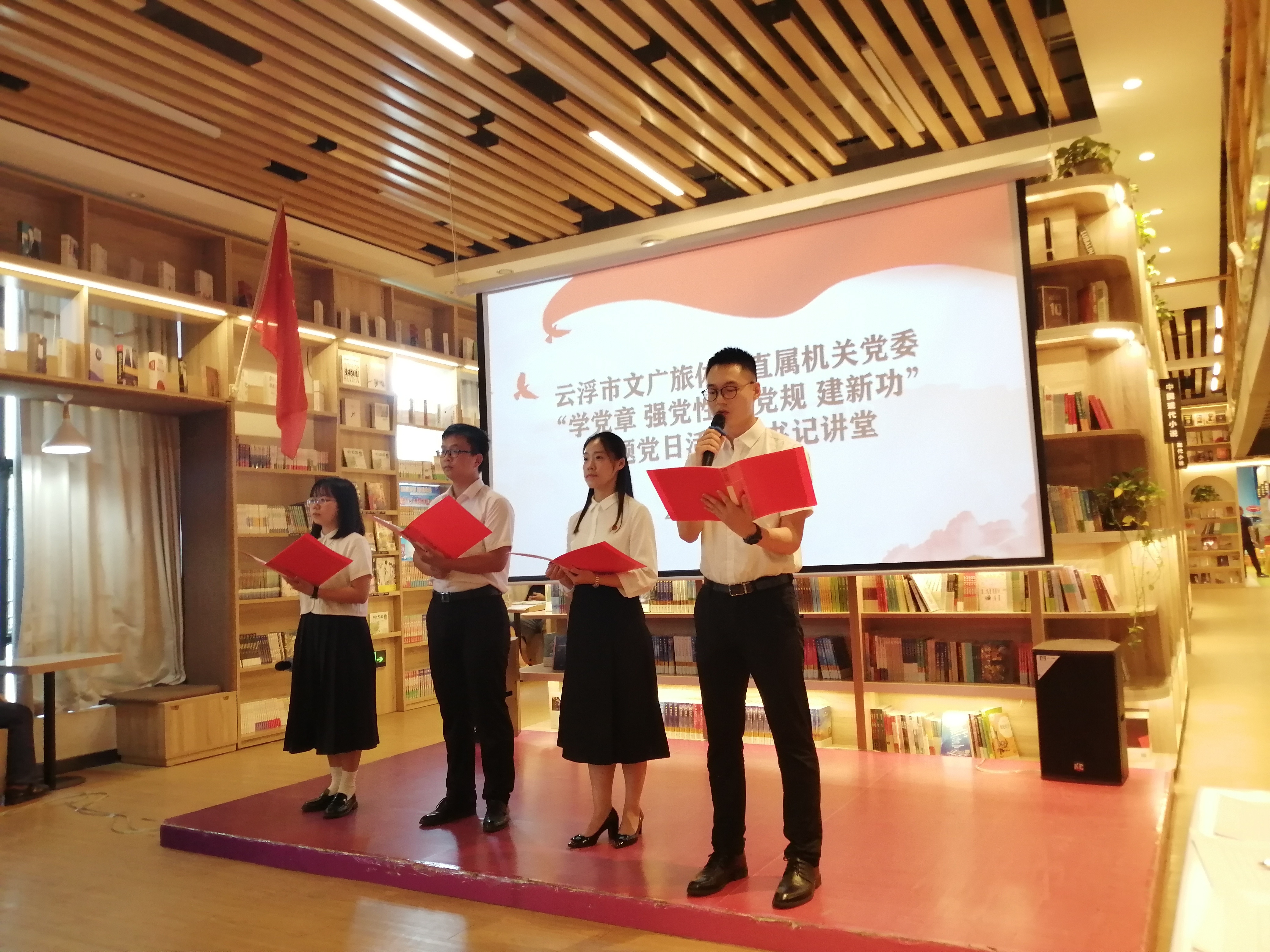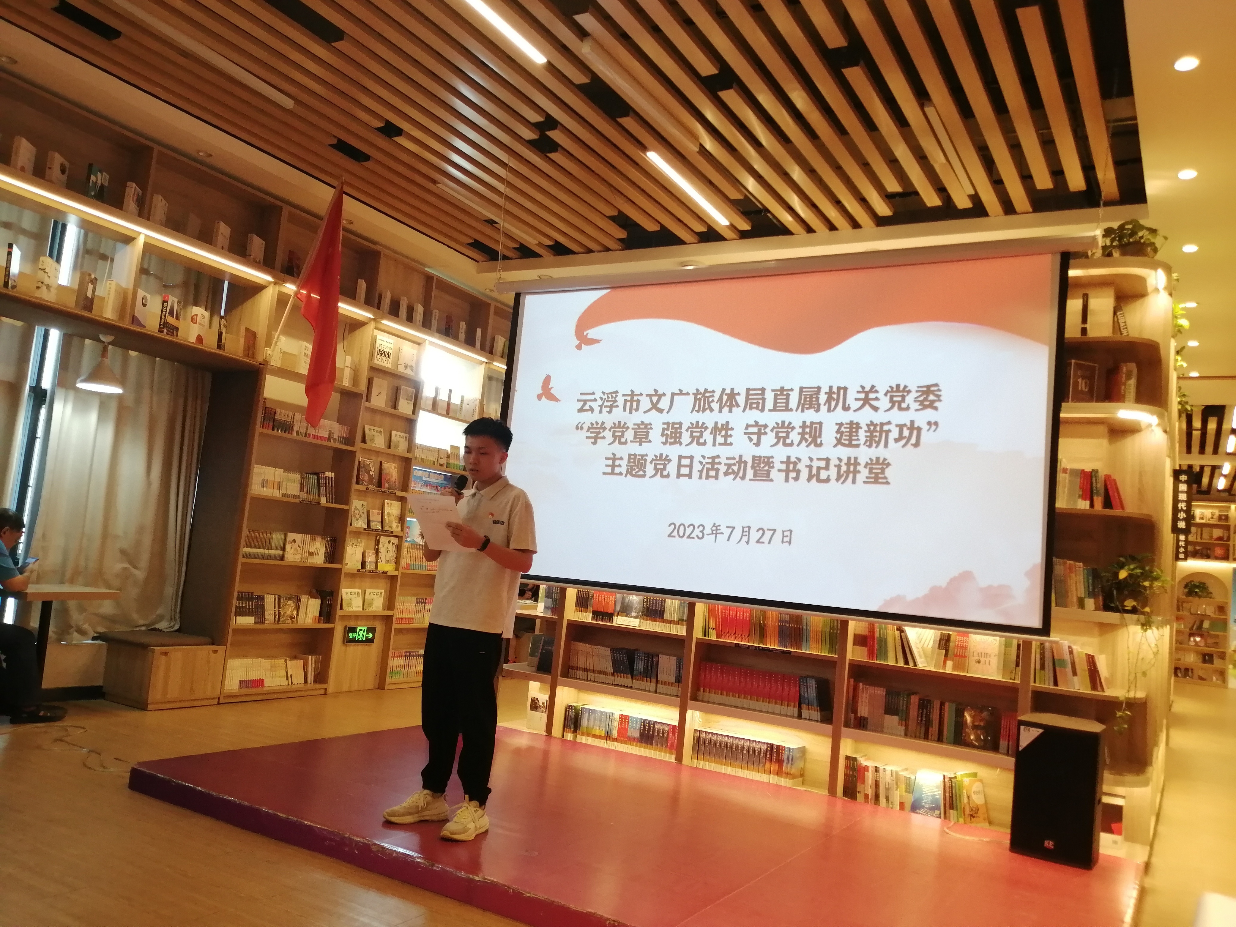 这是云浮市文广旅体局党组文书、局长、机关党委文书黄小涧同道在“学党章 强党性 守党规 建新功”主题党日动作暨文书讲堂上的讲课推行。7月27日下昼,在云浮市新华书店(四阅店)二楼的念书厅,云浮市文广旅体局直属机关党委的在任党员们,坐姿划定,庄重凝听着文书讲课的《党章的故事》。